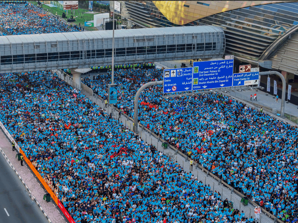 El récord del año anterior, 278.000 participantes, quedó pequeño. Dubái lo hizo otra vez: 307.000 personas, de 200 nacionalidades, corriendo juntas con más de 40° grados de temperatura.