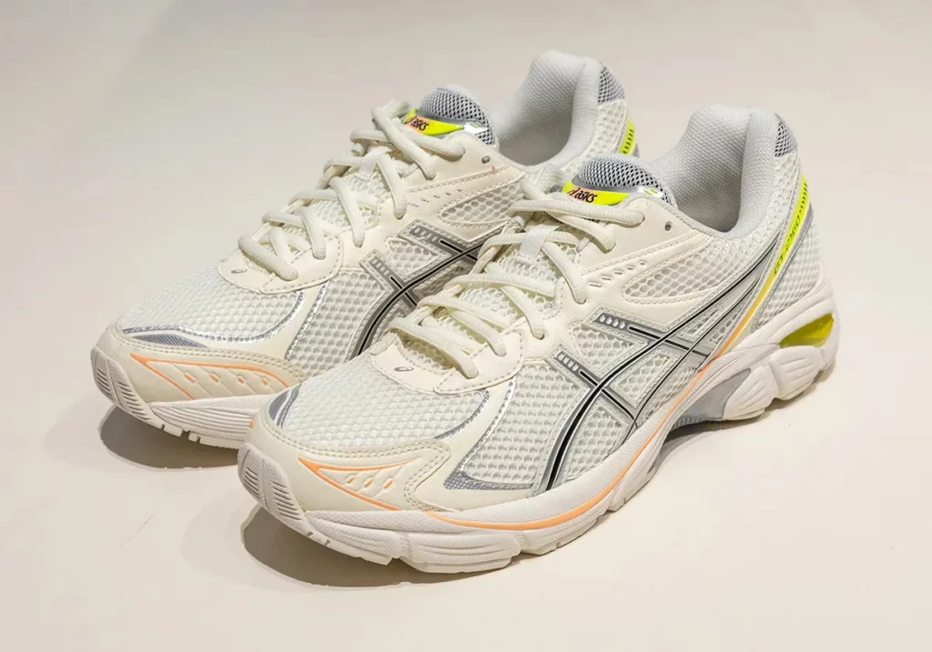 La parte superior de la zapatilla está confeccionada en malla, complementada con los emblemáticos revestimientos metálicos de ASICS en piel sintética. Las rayas en color “Safety Yellow” añaden un toque animado a la paleta de colores crema, destacando en la lengüeta y en las superposiciones que adornan el talón y partes de la suela.