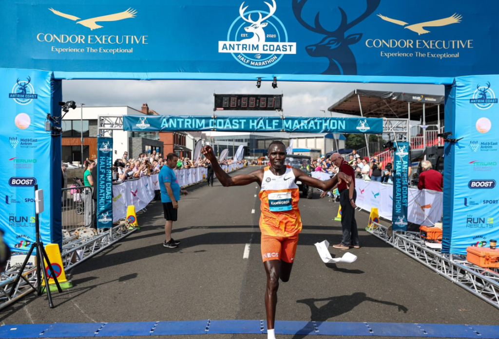 Como preparación para su participación en el Maratón de Chicago del próximo 12 de octubre, hoy domingo el keniata Geoffrey Kamworor corrió los 21K de Antrim Coast en Irlanda del Norte logrando el primer lugar con bastante comodidad al terminar en 59:51. Donde sí hubo pelea fue en el segundo y tercer lugar, definiéndose por sólo un segundo. El israelí Tadesse Getahon terminó en 1h01:21 el medio maratón por delante del británico y olímpico Phil Sesemann con 1h01:22 en su mejor marca en la distancia.