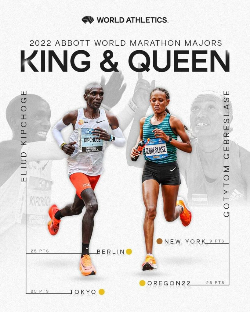 Noviembre de 2022. El keniata Eliud Kipchoge y la etíope Gotytom Gebreslase fueron los ganadores de la XIV series del World Marathon Major gracias a los triunfos este año 2022 en los maratones de Tokio y Berlín (con récord del mundo) en el caso de Kipchoge, y el del Mundial de Eugene y los terceros lugares en Tokio y Nueva York en el caso de Gebreslase.