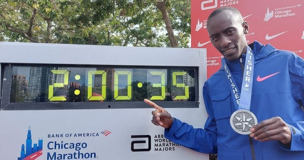 Chicago es recién el tercer maratón corrido por Kiptum. En todas ha ganado y en todas bajo las 2 horas y 2 minutos. Debutó el año pasado en Valencia con 2h01:53, siendo para ese tiempo el tercer mejor registro de todos los tiempos. Aunque ya había mostrado sus credenciales, pasó a ser una sería amenaza de nuevo dueño del récord del mundo al ganar meses después el Maratón de Londres en Inglaterra con 2h01:25, a sólo 16 segundos del tiempo hecho por Kipchoge.