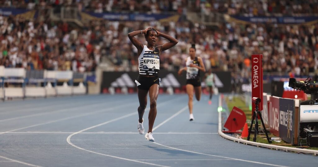 Hoy en la 4ta fecha de la Liga Diamante celebrada en París anotó un nuevo récord planetario a su bitácora al conseguir la mejor marca del mundo en los 5000 metros gracias al tiempo de 14:05´20 conseguido en las 12 vueltas y media a la pista. Así, superó los 14:06´62 que desde el 2021 tenía la etíope Letensebet Gidey quien compitió a la par hoy con Kipyegon, llegando segunda.